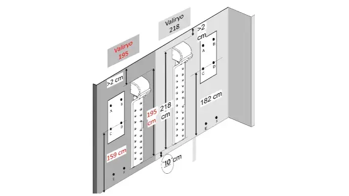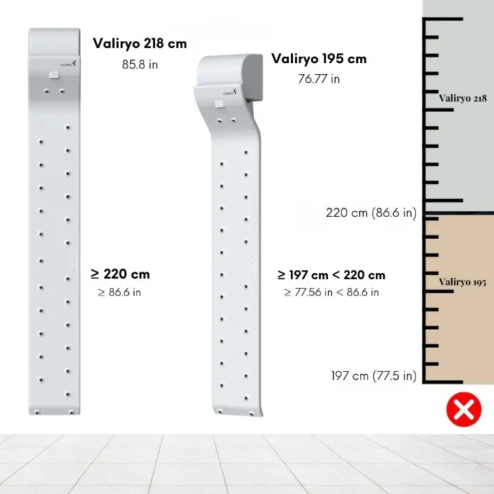 Our general recommendation is to choose the Valiryo 218 model if you have 220 cm (86.6 in) or more of available height at the installation location. If your available height is between 197 cm (77.5 in) and 220 cm, then your choice should be Valiryo 195.
